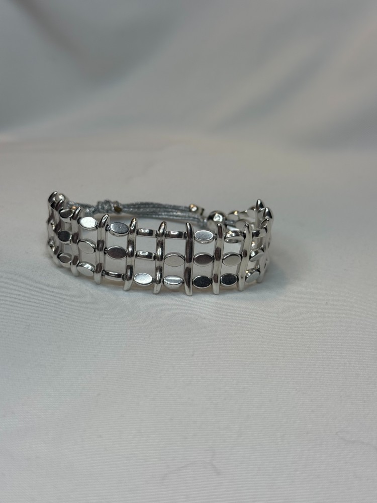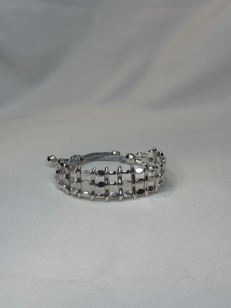 Πλεγμένο βραχιόλι με μεταλλόνημα και επαργυρωμένα ορειχάλκινα στοιχεία. Αυξομειώνει με μακραμέ δέσιμο.