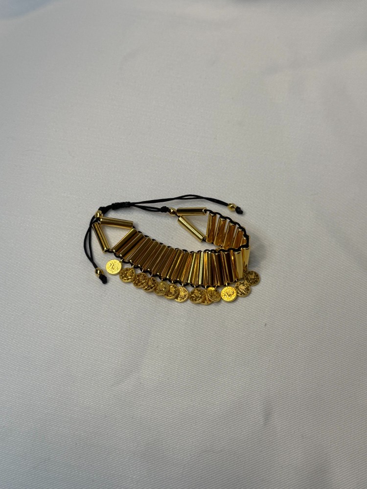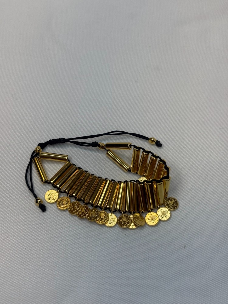 Πλεγμένο βραχιόλι με μεταλλόνημα και επαργυρωμένα ορειχάλκινα στοιχεία. Αυξομειώνει με μακραμέ δέσιμο.